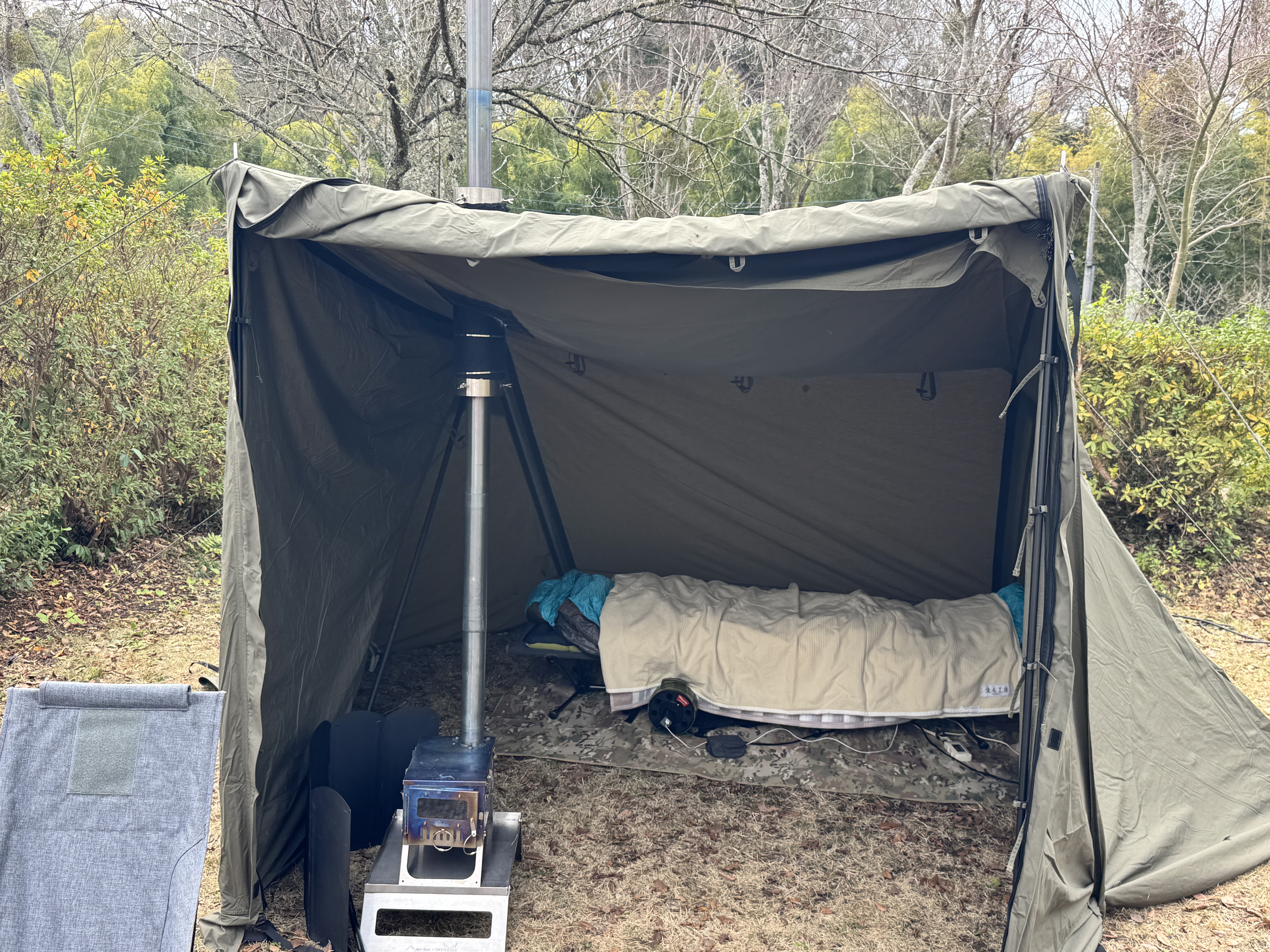 夕方で 6 度程度とそこそこの気温です。 さっそく薪ストーブに火を入れてぬくぬくお籠りキャンプの開始です←早すぎ。