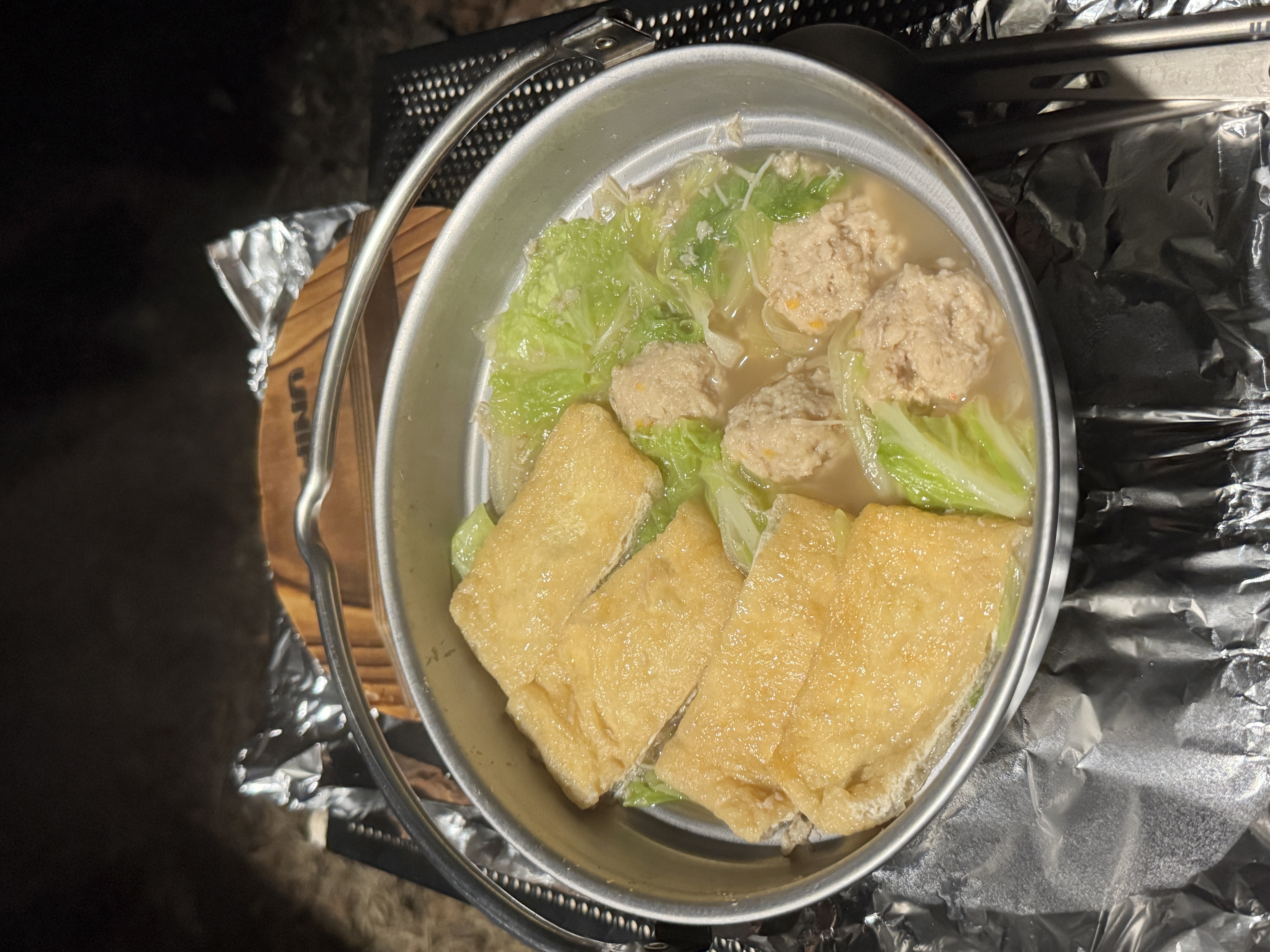 自宅から持参した白菜、水菜、大根、油揚げに