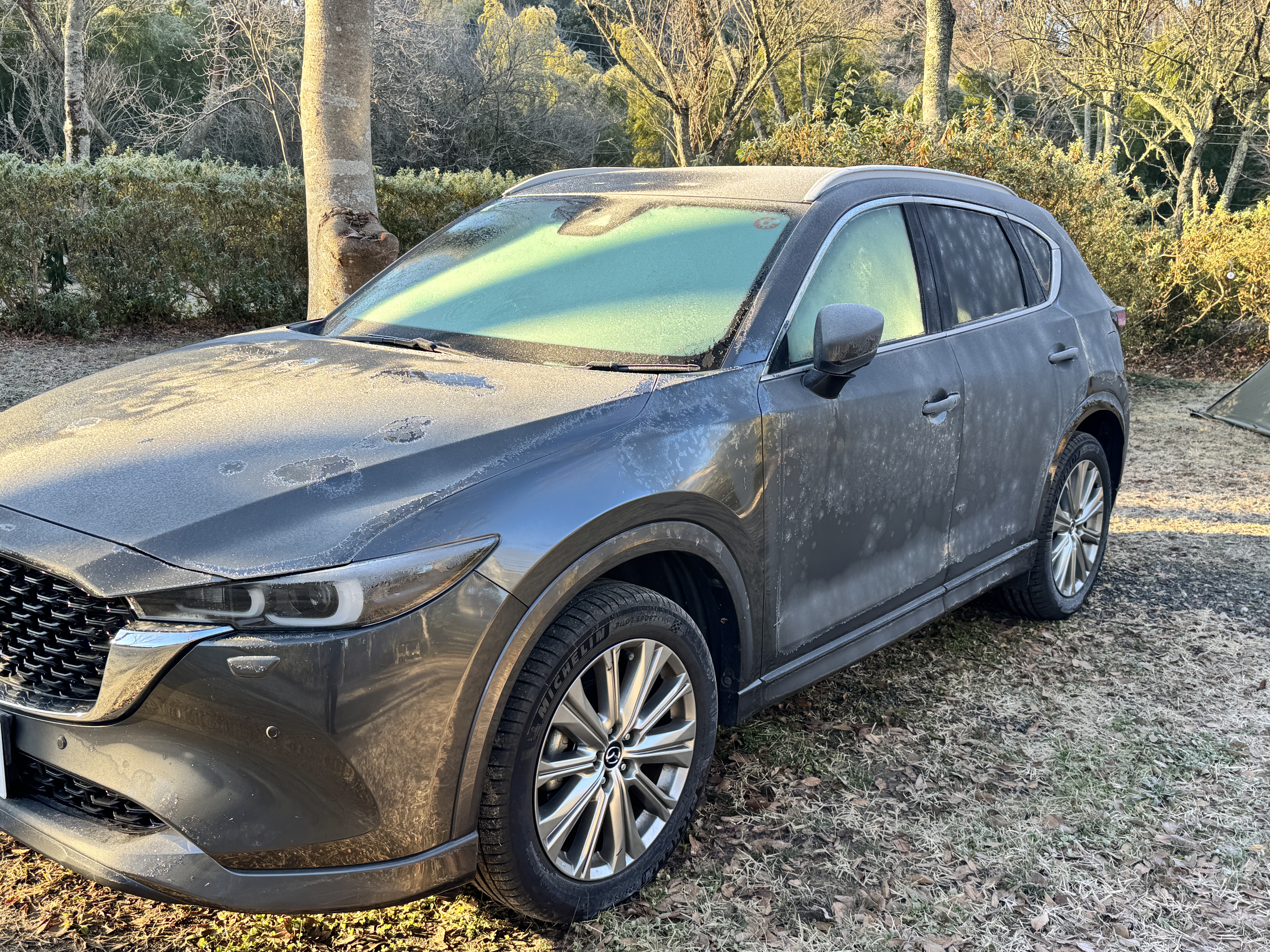 明け方の気温はなんと -4度まで下がっていました。 車も真っ白でした。
